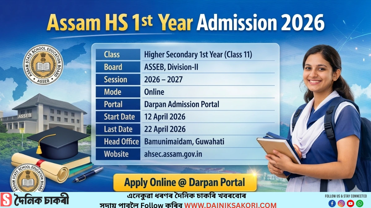 Good news for students who passed the HSLC Exam 2026 in Assam. The Assam State School Education Board (ASSEB), Division-II has started the HS 1st Year Online Admission 2026 process through the Darpan Portal. Students who want to take admission in Higher Secondary (HS) 1st Year / Class 11 for the 2026-2027 academic session can apply online through this portal. The online application process will start from 12 April 2026.