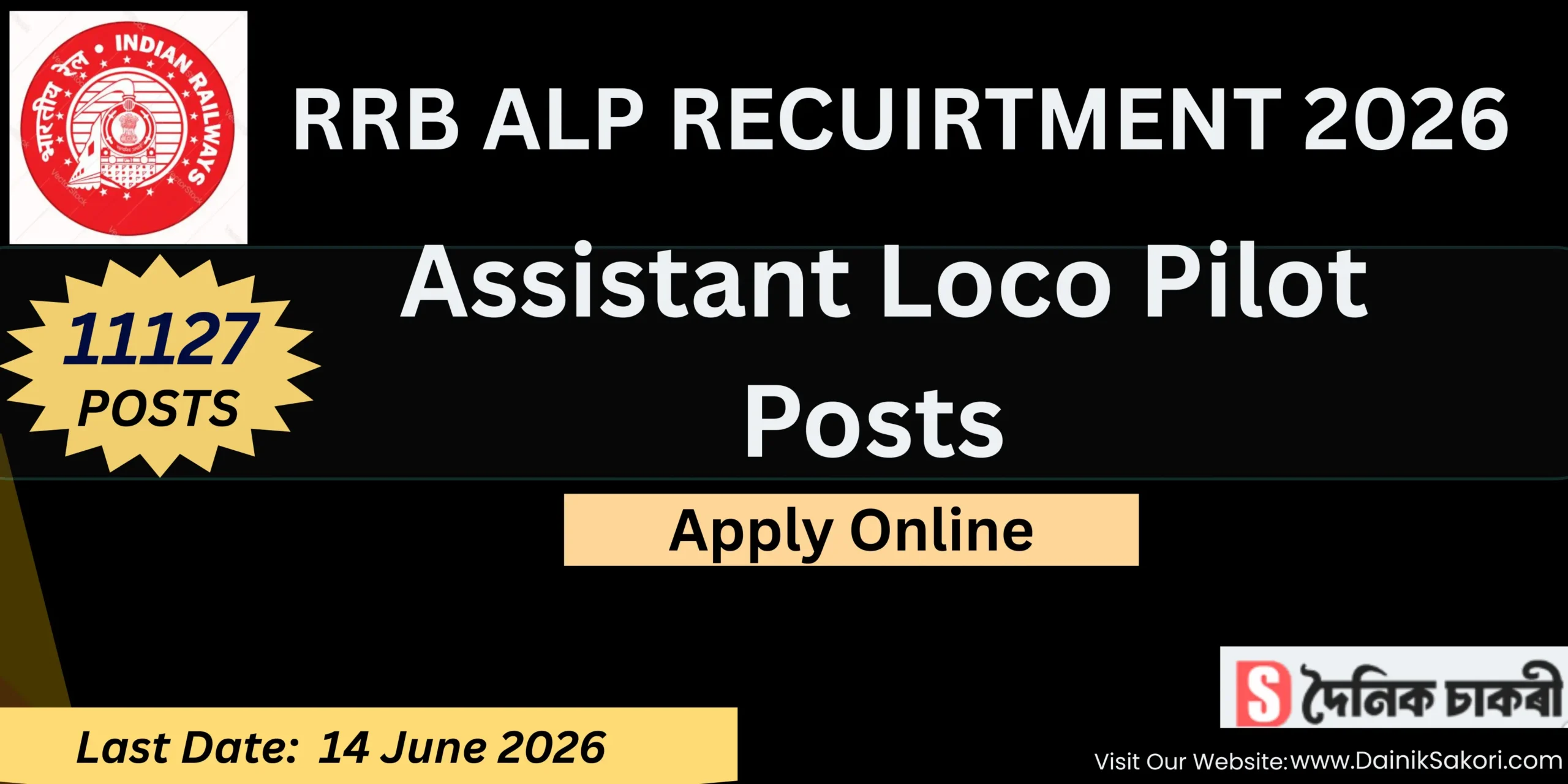 Railway Recruitment Board (RRB) under the Ministry of Railways has announced a new job notification (CEN 01/2026) for 11127 Assistant Loco Pilot (ALP) posts across India. The online application process will start from 15 May 2026 and will continue till 14 June 2026. Candidates who are eligible and interested are advised to check the official notification carefully and submit their application through online mode within the given dates here .