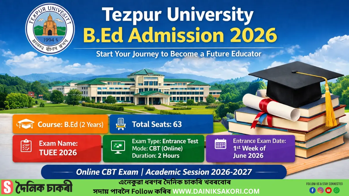 Tezpur University has released official notification for B.Ed Admission 2026-27. Interested candidates can apply online here. Apply for Tezpur University B.Ed Admission 2026. Check eligibility, fees, important dates, and TUEE details. Last date 30 April 2026.