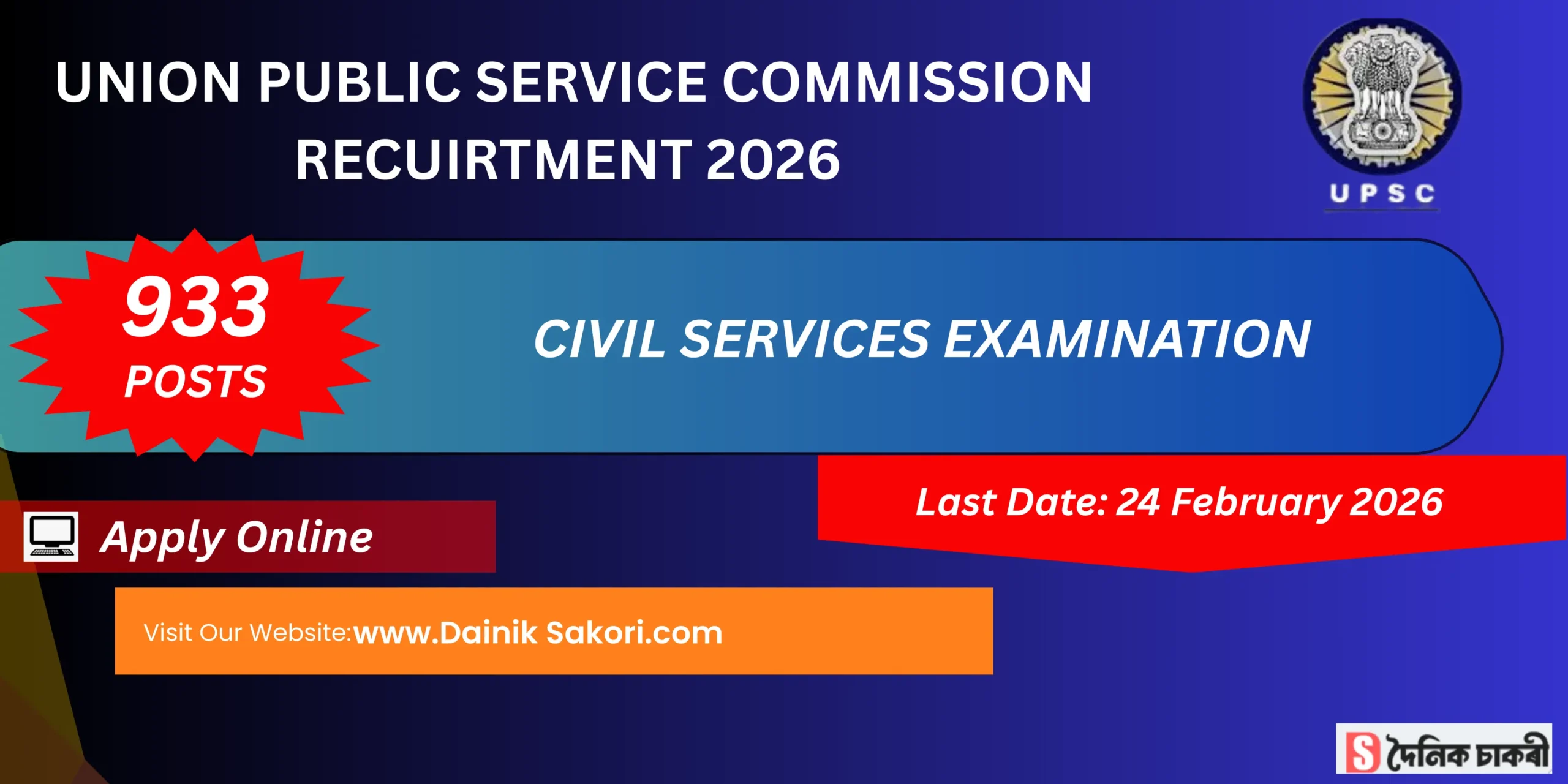 Union Public Service Commission Civil Services (Pre) Examination 2026 – 933 Posts, Online Apply